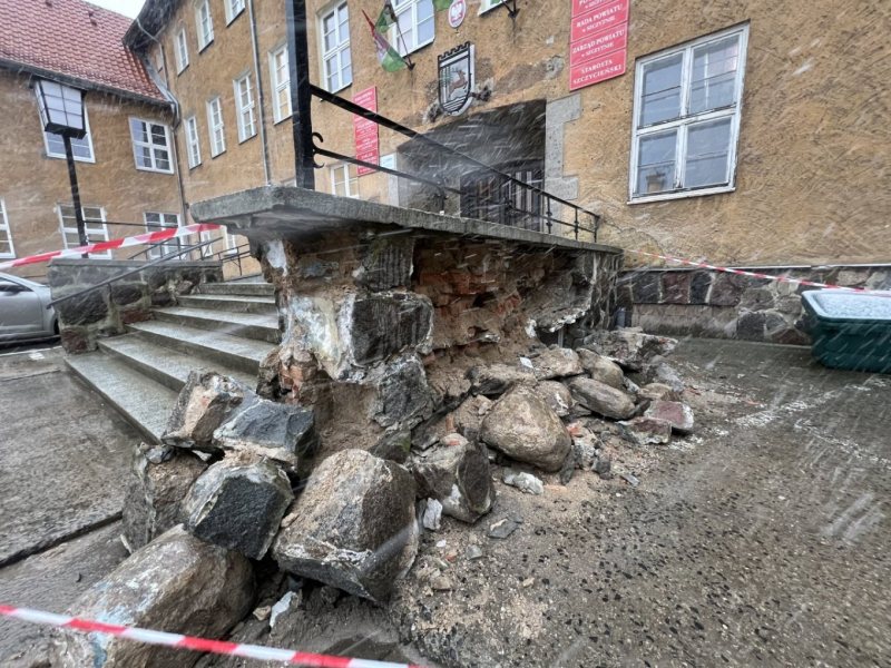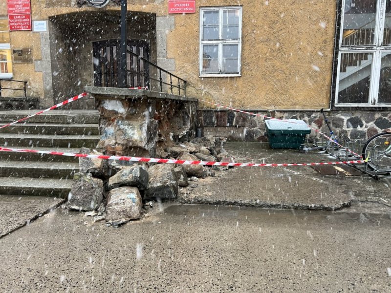 - Podejrzewamy, że mur z kamieni został uszkodzony przez mróz, dostała się tam woda i kamienie rozsadziło – mówi Piotr Paszkiewicz. - Miejsce jest zabezpieczone, schody wejściowe do urzędu są bezpieczne. Można z nich korzystać – zapewnia.