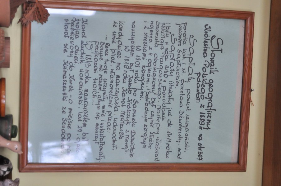 Mam taką nadzieję. Pojawiło się kilka bardzo aktywnych kobiet, które zaczęły działać w naszym sołectwie i liczę, że one mogą się tym zająć. Mówią, że pomogą. A ja chętnie bym im to już przekazała. Nie chciałabym, aby skarby naszego muzeum poszły do innej wsi, bo byłoby to takie zdradzenie tych mieszkańców Sąpłat, którzy angażowali się w powstanie tego muzeum. Wiele osób pomagało mi przy remoncie tej salki muzealnej. Czułabym się z tym bardzo źle, gdybym pozwoliła na przeniesienie tego muzeum do Linowa. Zgodziłabym się jedynie na kompromis taki, aby eksponaty trafiły do Dźwierzut, od ośrodka kultury, który jak zostanie rozbudowany mógłby wygospodarować salę na taką izbę pamięci.