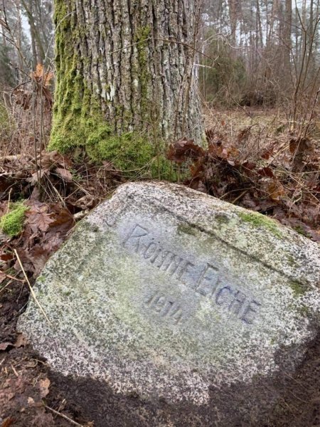 Przetarłem, trochę odkopałem, a pod spodem zaczęły wychodzić ledwo widoczne inskrypcje. Wróciłem tam z drucianą szczotką i grubym ołówkiem. Udało mi się odtworzyć napis! Głaz oraz dąb (ponad stuletni!) upamiętniają, jak sądzę, rodzinę von Rönne lub też samego starostę. W herbie rodziny znajduje się dąb! Odnalazłem również żyjących członków rodziny w Niemczech, z którymi zamierzam się skontaktować.