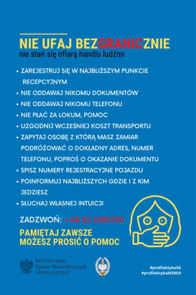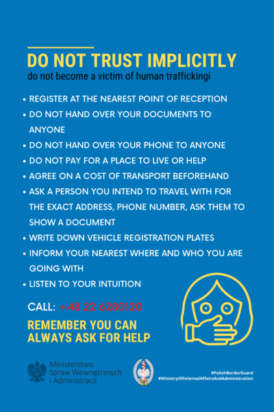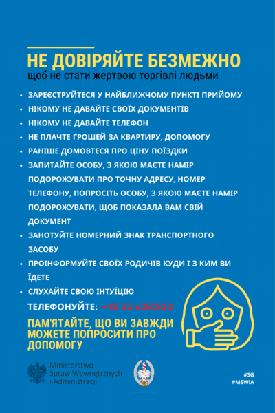 W związku z powyższym Biuro Prezydialne Komendy Głównej Straży Granicznej i Departament Spraw Międzynarodowych i Migracji MSWiA wspólnie opracowali merytorycznie i graficznie ulotkę skierowaną do obywateli Ukrainy przekraczających granice polsko-ukraińską. W przypadku jakiegokolwiek podejrzenia handlu ludźmi - obywatele Ukrainy, jak również wszystkich innych państw mogą prosić o pomoc Krajowe Centrum Informacyjno-Konsultacyjne.