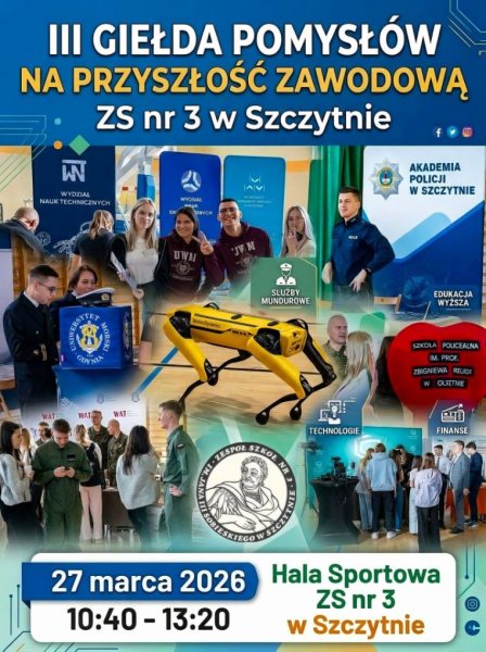Piątek, 27 marca w hali sportowej Zespołu Szkół nr 3 im. Jana III Sobieskiego w Szczytnie odbędzie się III Giełda Pomysłów na Przyszłość Zawodową. Wydarzenie potrwa od godz. 10:40 do 13:20. To spotkanie dla uczniów, którzy szukają kierunku i chcą zobaczyć, jak wygląda praca w konkretnych branżach. Na miejscu pojawią się przedstawiciele uczelni, służb i instytucji, w tym Bank Spółdzielczy w Szczytnie.