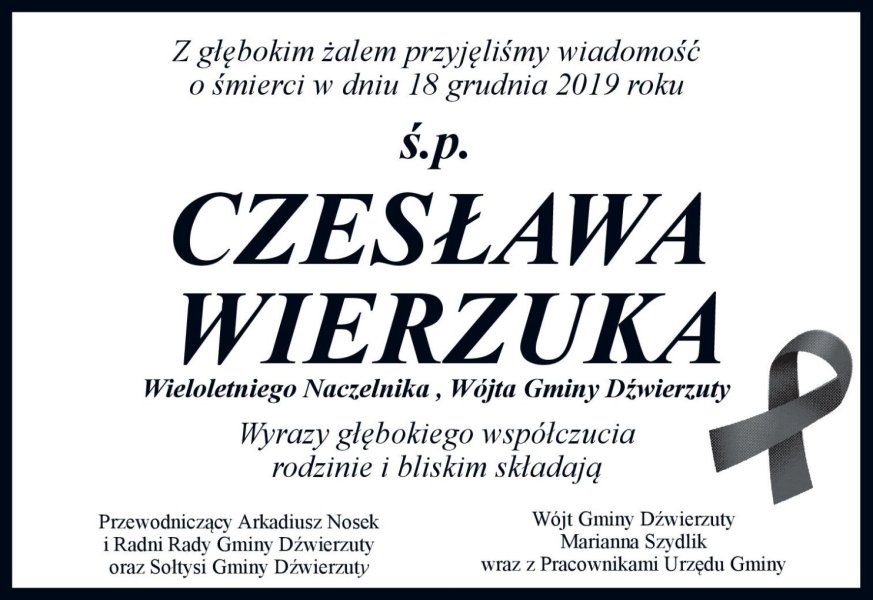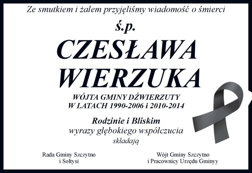 Śpij spokojnie Wójcie Wierzuk :(...........żył Mazurami i żył dla Dźwierzut. Życzę Nam wszystkim ludzi tak oddanych Naszej ziemi jak Wójt. Dziękuję Panie Wójcie Czesławie Wierzuk !!!!