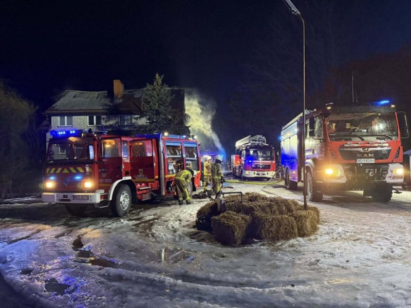 Nocny pożar w Brajnikach. Ogień zajął poddasze „bliźniaka”. Zgłoszenie wpłynęło 23 lutego 2026 roku o godz. 23:18. Na miejsce jako pierwsi wyjechali strażacy z OSP Jedwabno – dwa zastępy: GBARt MAN oraz GCBARt Scania.