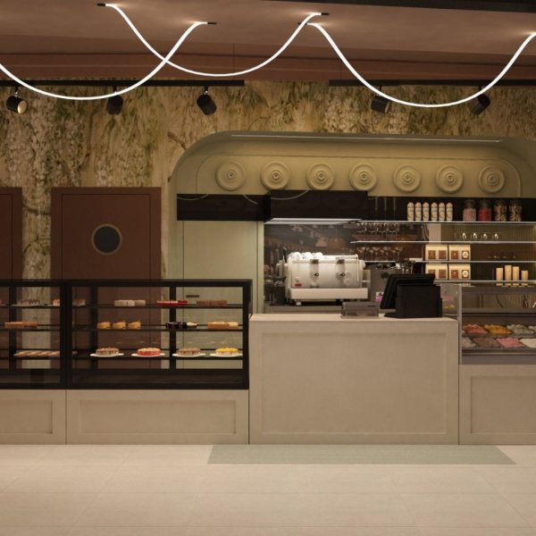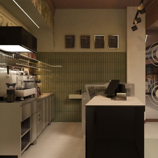 W kawiarni dominuje harmonia barw: neutralne beże, ciemne drewno i subtelna zieleń, tworząc atmosferę elegancji i spokoju.