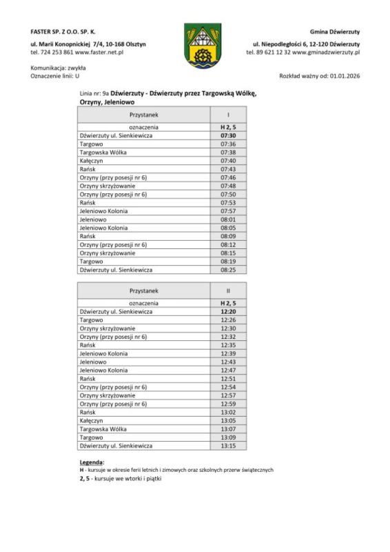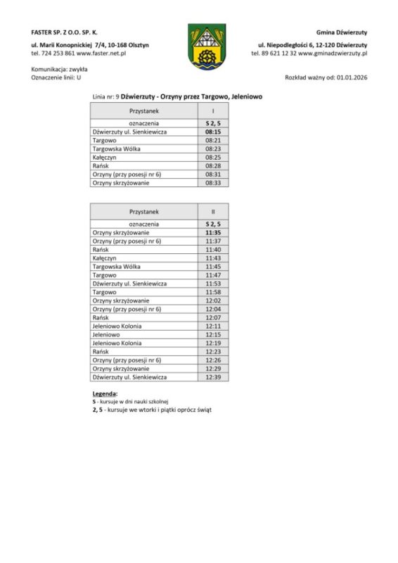 Organizatorem transportu jest gmina Dźwierzuty, a obsługę realizuje przewoźnik zewnętrzny. Rozkłady jazdy zostały ułożone z myślą o uczniach, osobach pracujących i seniorach. Część kursów będzie realizowana w dni nauki szkolnej, inne we wtorki i piątki lub w wybrane dni tygodnia.