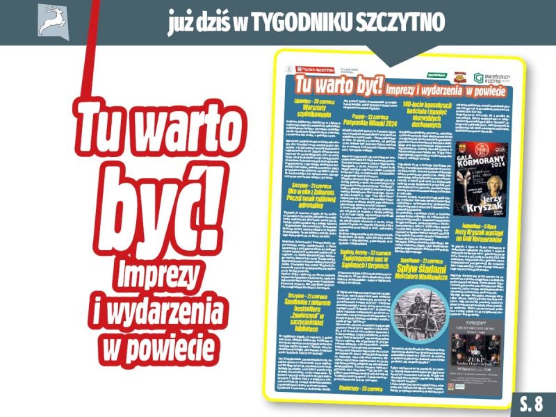 W tym tygodniu na stronie 8 znajdziecie szczegółowy wykaz wakacyjnych wydarzeń w naszym powiecie. Od koncertów po festyny – każdy znajdzie coś dla siebie! Co czwartek publikujemy nowy harmonogram, więc bądźcie na bieżąco z tym, co dzieje się w Szczytnie, Pasymiu, Wielbarku, Jedwabnie, Dźwierzutach, Rozogach i Świętajnie.