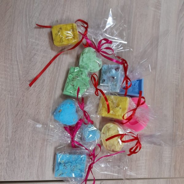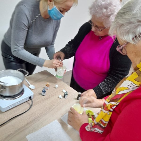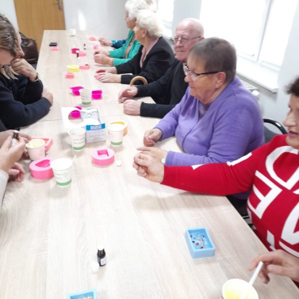 Uczestnicy wykonali własnoręcznie pachnące mydełka. Seniorzy tworzyli je z kolorowego żelu i przyozdobili suszonymi kwiatkami oraz ziołami. Zajęcia bardzo podobały się gościom, które przebiegały w uroczystej atmosferze, przy skromnym słodkim poczęstunku.