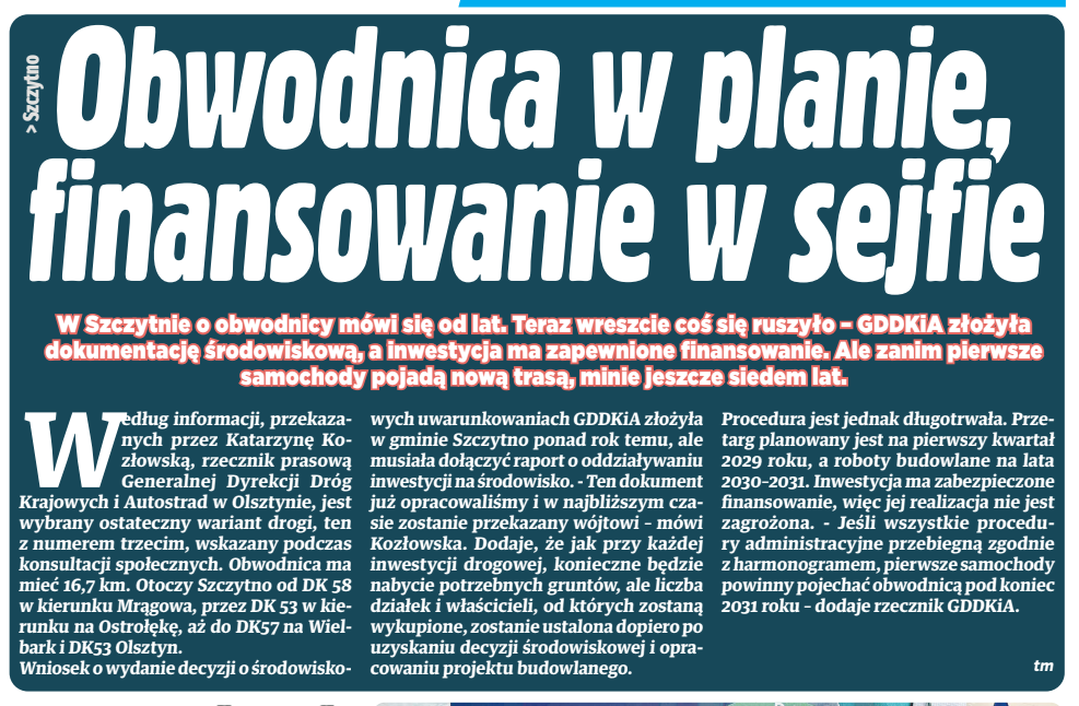 W Szczytnie o obwodnicy mówi się od lat. Teraz wreszcie coś się ruszyło – GDDKiA złożyła dokumentację środowiskową, a inwestycja ma zapewnione finansowanie. Ale zanim pierwsze samochody pojadą nową trasą, minie jeszcze siedem lat.