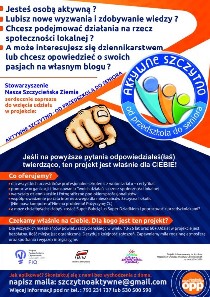 Za sprawą Pawła Krassowskiego i jego Stowarzyszenia Nasza Szczycieńska Ziemia pokolenia z powiatu szczycieńskiego łączą siły. Młodzież i seniorzy będą mogli wspólnie zrealizować kilka niezwykłych projektów, a przy okazji nabyć potrzebne umiejętności z zakresu tworzenia wydarzeń muzycznych, kulturalnych, czy sportowych oraz nauczyć się dziennikarskiego fachu, przy budowaniu strony internetowej. Liczba miejsc jest ograniczona. Trwa rekrutacja do projektu. Szczegóły można uzyskać pod numerem telefonu: 793 231 737 lub mailem szczytnoaktywne@gmail.com.