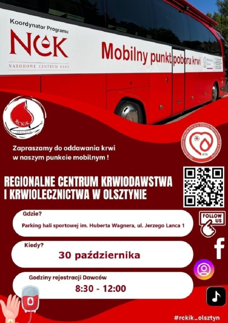 30 października na parkingu hali sportowej im. Huberta Wagnera przy ul. Jerzego Lanca 1 w Szczytnie pojawi się mobilny punkt poboru krwi Regionalnego Centrum Krwiodawstwa i Krwiolecznictwa w Olsztynie.