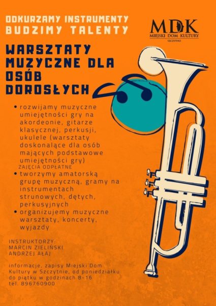 Warsztaty skierowane są do osób dorosłych i obejmują naukę gry na gitarze klasycznej, akordeonie, perkusji, ukulele i wielu innych instrumentach. Zajęcia poprowadzą Andrzej Ałaj i Marcin Zieliński.