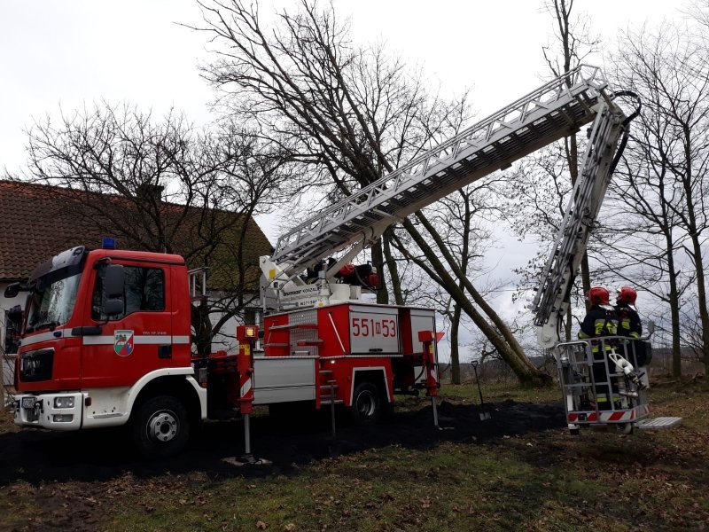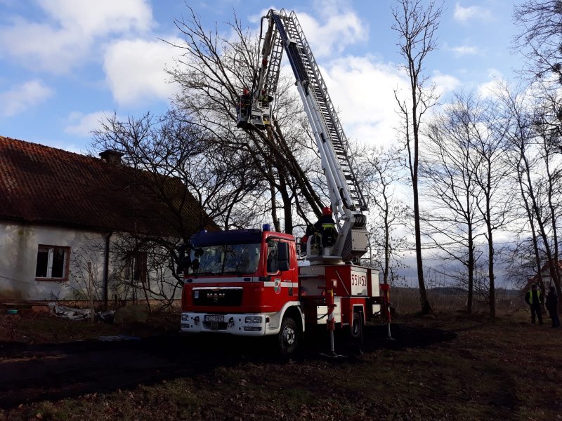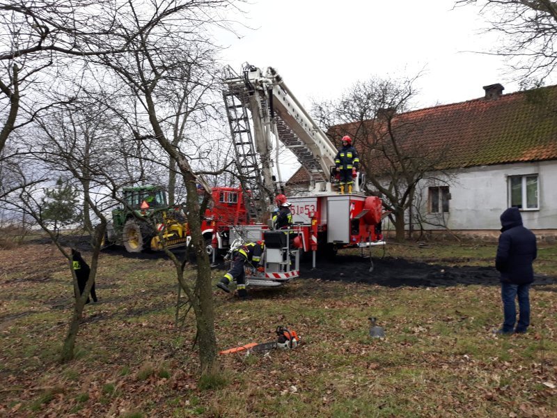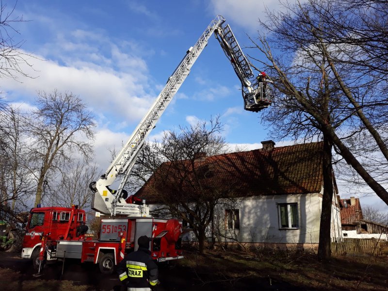 Kierujący działami wezwał na miejsce zdarzeń drabinę hydrauliczną w celi usunięcia pochylonych nad dachem domu drzew. Ratownicy na miejscu wykonali też dwa wjazdy, wycinając krzaki i małe drzewa.