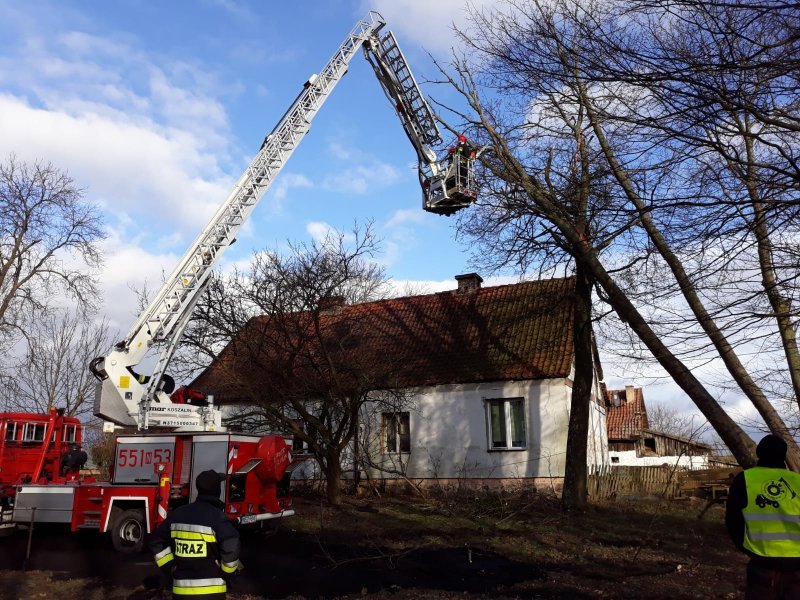 Potężne suche drzewa przewróciły się i zawisły nad jednym z domów mieszkalnych w Trelkowie. Oparły się o inne zdrowe drzewo i tylko dlatego nie doszło do tragedii. Na miejscu przez kilka godzin z zagrożeniem walczyli strażacy.