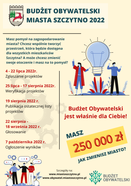 Projekty można zgłaszać do piątku, 22 lipca do godz. 15:30 w Biurze Obsługi Interesanta w Urzędzie Miejskim w Szczytnie. Formularz wraz z listą poparcia projektu dostępne są: