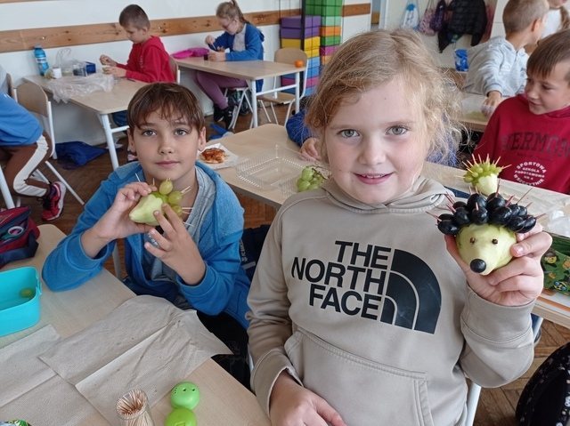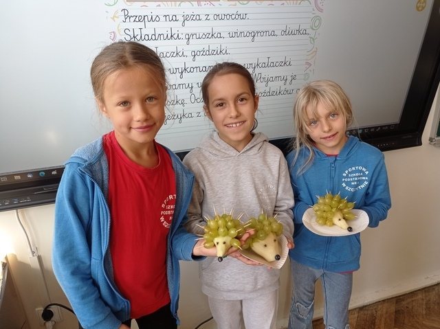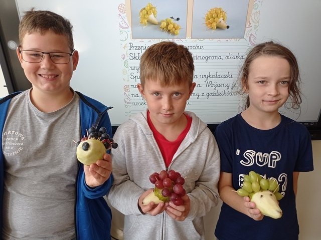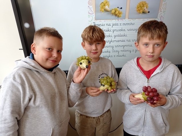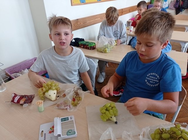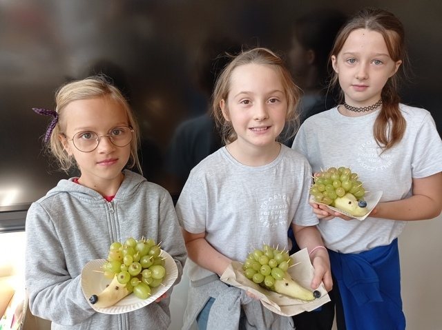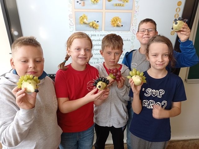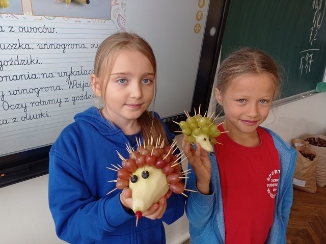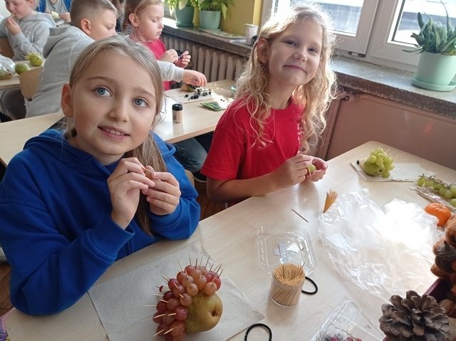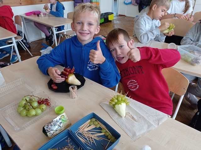 Zajęcia z edukacji wczesnoszkolnej zamieniły się w kulinarną przygodę, podczas której dzieci przygotowywały jeżyki z owoców. Uczniowie z radością kroili, układali i komponowali swoje owocowe przysmaki.