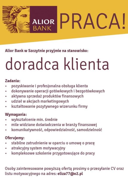 Alior Bank w Szczytnie przyjmie na stanowisko: doradca klienta.