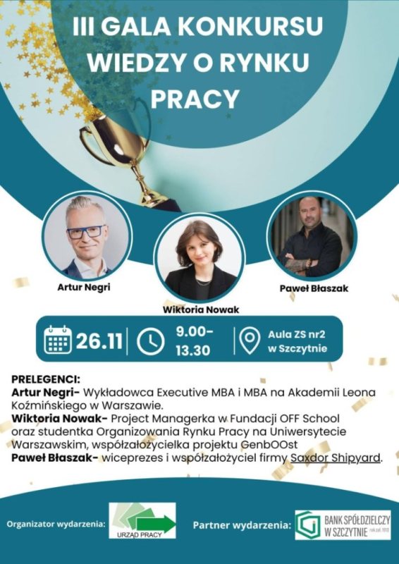 Powiatowy Urząd Pracy w Szczytnie zaprasza laureatów, finalistów, ich rodziców i nauczycieli na galę III edycji Konkursu Wiedzy o Rynku Pracy. To moment, w którym wyróżnieni uczniowie odbiorą nagrody i podsumują swoje osiągnięcia.