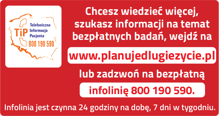 Chcesz wiedzieć więcej, szukasz informacji na temat bezpłatnych badań, wejdź na: www.planujedlugiezycie.pl lub zadzwoń na bezpłatną infolinię 800 190 590.