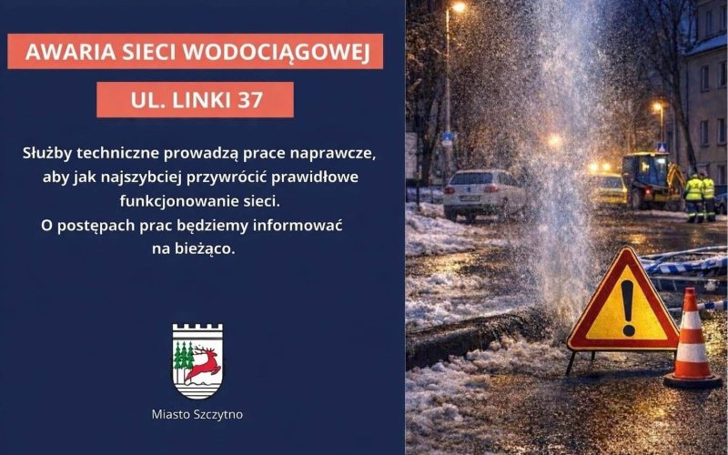 Miejski ratusz poinformował o awarii sieci wodociągowej przy ul. Linki 37 w Szczytnie. Na miejscu pracują służby techniczne. Trwa usuwanie usterki i przywracanie dostaw wody.