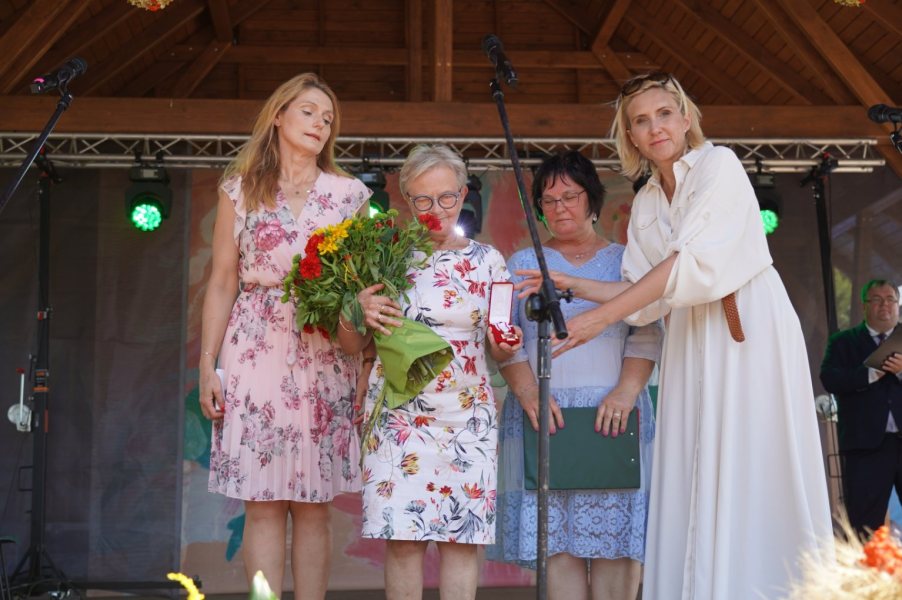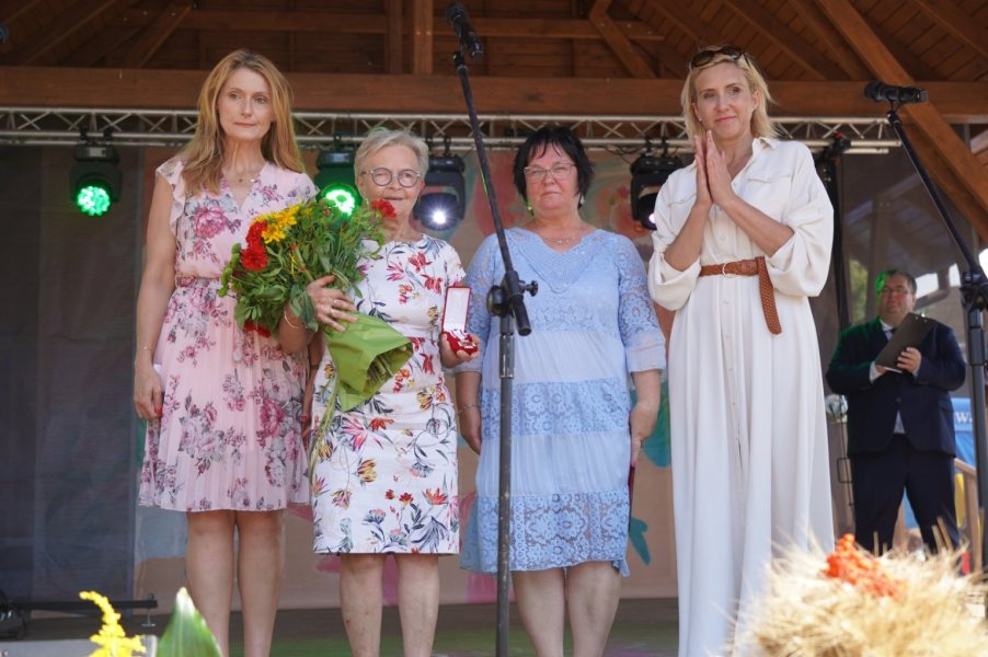 Święto plonów było także okazją do uhonorowania i podziękowania zasłużonym mieszkańcom naszej gminy. Medal zasłużony dla Województwa Warmińsko – Mazurskiego z rąk Wicemarszałek Województwa Warmińsko – Mazurskiego Pani Sylwii Jaskulskiej oraz Posłanki Urszuli Pasławskiej otrzymał Pan Andrzej Kabała. Wyróżnienie w konkursie powiatowym „Supersołtys Powiatu Szczycieńskiego 2023 ” z rąk Pana Jerzego Szczepanka – Wicestarosty Powiatu Szczycieńskiego odebrała Pani Elżbieta Pałasz – Sołtys Sołectwa Jedwabno.