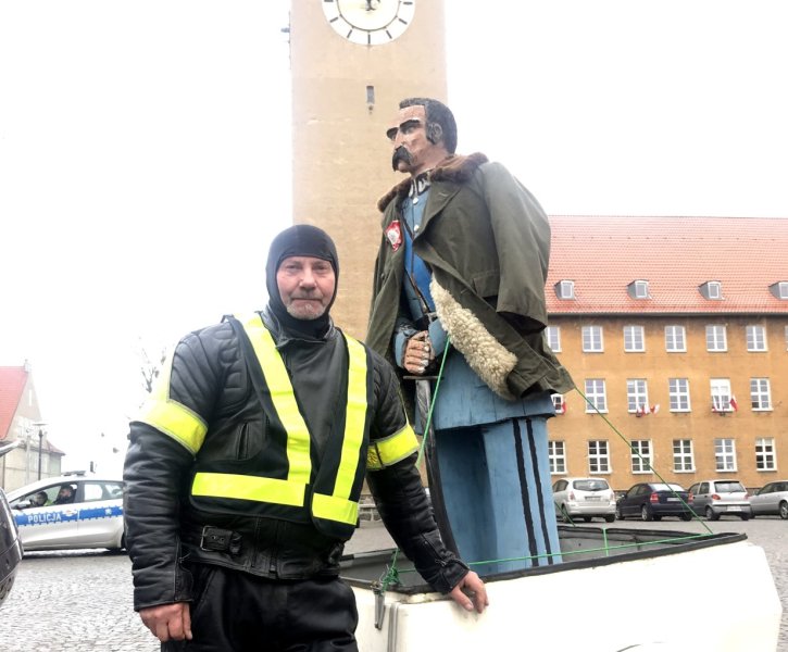 Radny na specjalnej przyczepce umieścił własnoręcznie wyrzeźbioną postać marszałka Józefa Piłsudskiego. Przyczepkę podpiął do motocykla i tak jeźdź po Szczytnie.