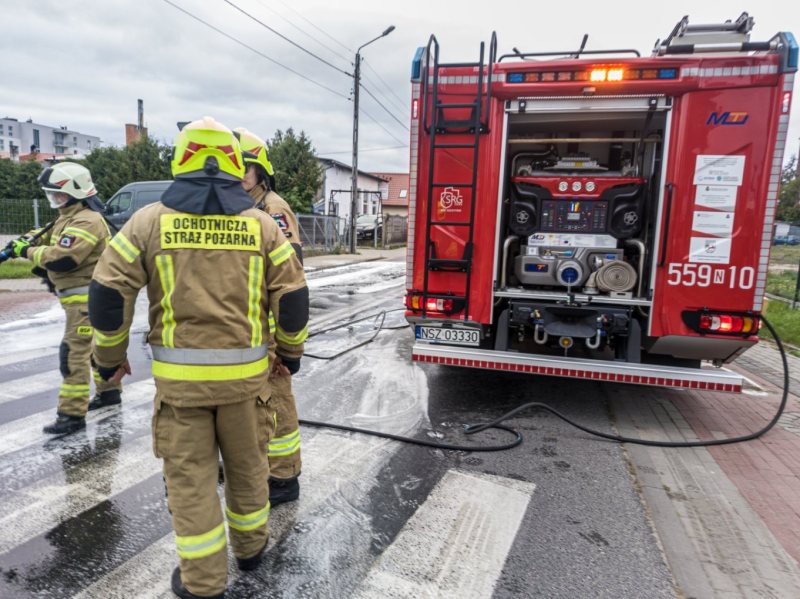 W poniedziałek, 29 września przed 17:00 na ul. Dąbrowskiego w Szczytnie powstała plama oleju, stwarzająca zagrożenie poślizgu w okolicach skrzyżowania oraz przejścia dla pieszych. Strażacy PSP i OSP Szczytno usunęli zagrożenie za pomocą środka powierzchniowo-czynnego.