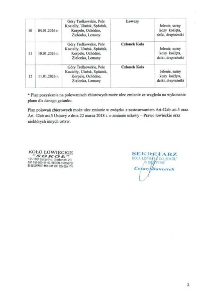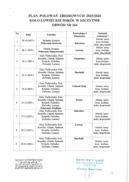 Pierwsze polowanie odbędzie się 26 października w Sędańsku i Korpelach – będzie to tzw. polowanie seniorów. W planie znalazły się również polowania hubertowskie, wigiliine oraz kilkanaście spotkań w lasach na terenie gminy Szczytno. Wykaz obejmuje m.in. Góry Trelkowskie, pola w Koziełłach, Ułańsku, Sędańsku, Zielonce, Lemany i Ochódnie.