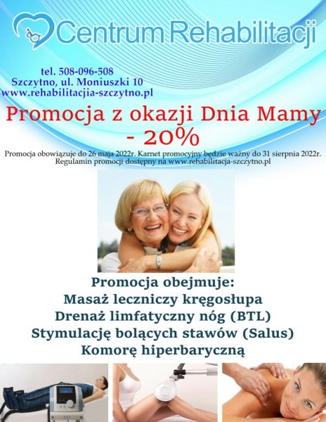 Centrum Rehabilitacji znajdujące się przy ulicy Moniuszki 10 w Szczytnie przygotowało specjalną ofertę z okazji Dnia Mamy. Warto tym wyjątkowym kobietom podarować zdrowie i relaks. A w ofercie Centrum Rehabilitacyjnego jest w czym przepierać, dostępnych jest bowiem kilkadziesiąt zabiegów, w tym między innymi masaże, czy komora hiperbaryczna...