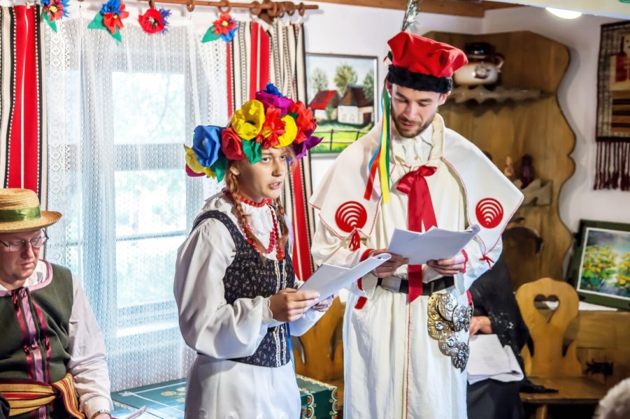 Działania połączonych sił pracowników Biblioteki Miejskiej i członków Towarzystwa Przyjaciół Szczytna dzielnie wspomagały zespoły ludowe: Wystek i Kolonianki, które w sąsiedniej izbie śpiewały pomiędzy kolejnymi wystawianymi aktami „Wesela”.