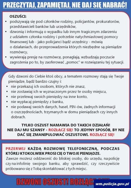 W przypadku jakichkolwiek podejrzeń, że nie jest to członek rodziny, tylko oszust lub w chwili, gdy telefonująca osoba postępuje w podany powyżej sposób, PROSIMY O NATYCHMIASTOWE POWIADOMIENIE POLICJI pod numer tel. 112 lub bezpośrednio Dyżurnego Komendy Powiatowej Policji w Szczytnie tel. (47) 733 12 00.