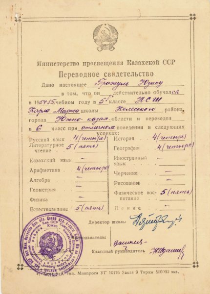 / Świadectwo Józefa Grażula z rosyjskiej szkoły w roku 1954/1955, skan ze zbiorów ks. J. Grażula
