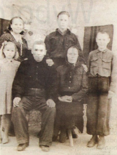 / Rodzina Grażulów w Kazachstanie: siedzą Rodzice Witold i Teofila, stoją z tyłu Teresa oraz Jan, z przodu Maria i Józef, rok 1955, fot. ze zbiorów J. Grażula