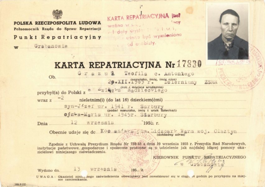 / Karta repatriacyjna Teofili Grażul z roku 1956, skan ze zbiorów ks. J. Grażula