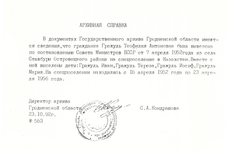 / Zaświadczenie archiwalne z 1992 r. potwierdzające zesłanie Teofili Grażul z dziećmi do Kazachstanu, skan ze zbiorów J. Grażula
