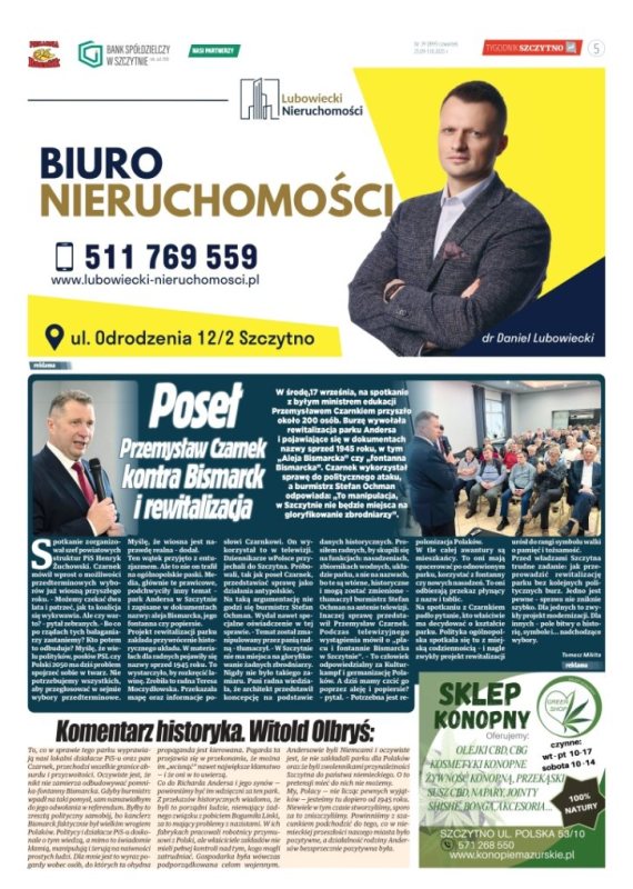 W środę,17 września, na spotkanie z byłym ministrem edukacji Przemysławem Czarnkiem przyszło około 200 osób. Burzę wywołała rewitalizacja parku Andersa i pojawiające się w dokumentach nazwy sprzed 1945 roku, w tym „Aleja Bismarcka” czy „fontanna Bismarcka”. Czarnek wykorzystał sprawę do politycznego ataku, a burmistrz Stefan Ochman odpowiada: „To manipulacja, w Szczytnie nie będzie miejsca na gloryfikowanie zbrodniarzy”.