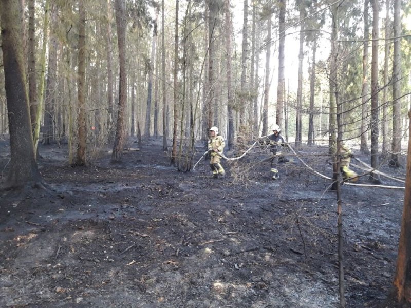 Na miejscu wciąż rozgrzaną i suchą ziemię przelewają wodą strażacy z OSP oraz pracownicy nadleśnictwa.