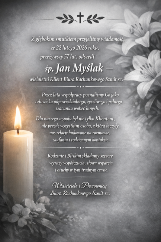 Z głębokim smutkiem przyjęliśmy wiadomość, że 22 lutego 2026 roku, przeżywszy 57 lat, odszedł śp. Jan Myślak – wieloletni Klient Biura Rachunkowego Szmit sc.