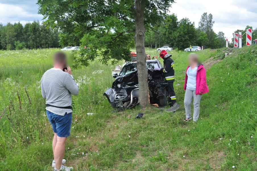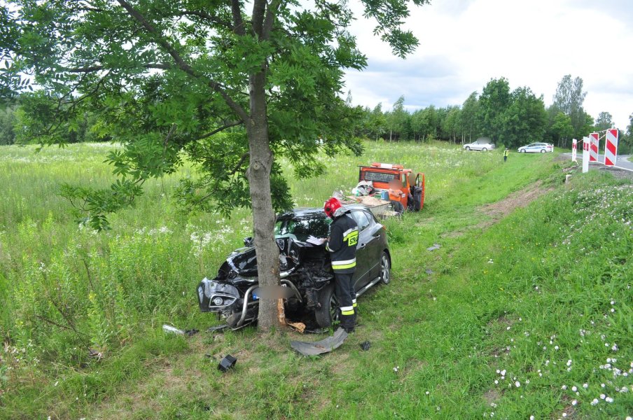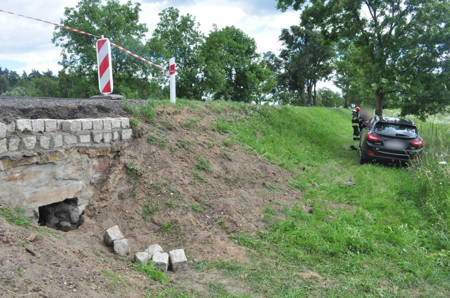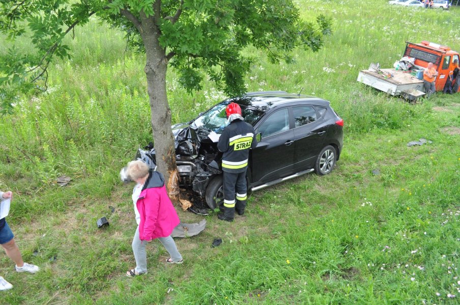 Do dramatycznego wypadku doszło w okolicach Dębówka. Kierowca hyundaia próbując uniknąć czołowego zderzenia ze skodą, która zajechała mu drogę, odbił w prawo, przeleciał przez przepust, który akurat był remontowany i zatrzymał się na drzewie.