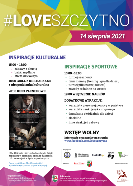 Trochę tradycyjnych i parę nowych. Przygotowaliśmy m.in. turniej szachowy w plenerze, podwórkowy turniej piłki nożnej dla dzieci, gry i zabawy z tenisem ziemnym, warsztaty frisbee ultimate, slackline. Na najmłodszych czekać będą dmuchana zjeżdżalnia, wata cukrowa, bańki mydlane oraz inne niespodzianki. Ciekawym punktem programu będą występy lokalnej młodzieży, która zaprezentuje swoje muzyczne aranżacje. Wieczorem zapraszamy do kina plenerowego na inspirujący film „The Ulimate Life”.
