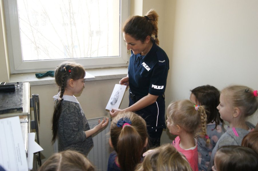 Następnie przedszkolaki wraz z asp. szt. Anną Walerzak zostały oprowadzone po budynku komendy. - Zobaczyły jak wygląda Niebieski Pokój, który jest przeznaczony do przesłuchań dzieci – mówi Mendelewska. - W trakcie spotkania dzieci miały okazję zobaczyć stół daktyloskopijny oraz zostawić swoje odbitki rączek na kartach. Ponadto dzieci wysłuchały st. asp. Tomka Walerzaka, który opowiedział o przesłuchaniach osób nieletnich.