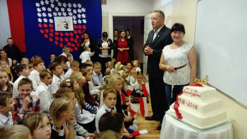 Wręczono też nagrody i wyróżnienia zwycięzcom szkolnego „Dyktanda Niepodległościowego”. Jednak największą świąteczną radość – niespodziankę zapewnił uczniom dyrektor szkoły Andrzej Modzelewski, dostarczając... wielki tort z biało-czerwoną flagą. A jak tort, to absolutnie konieczne było odśpiewanie gromkiego „Sto lat” - oczywiście solenizantce czyli niepodległej Polsce.