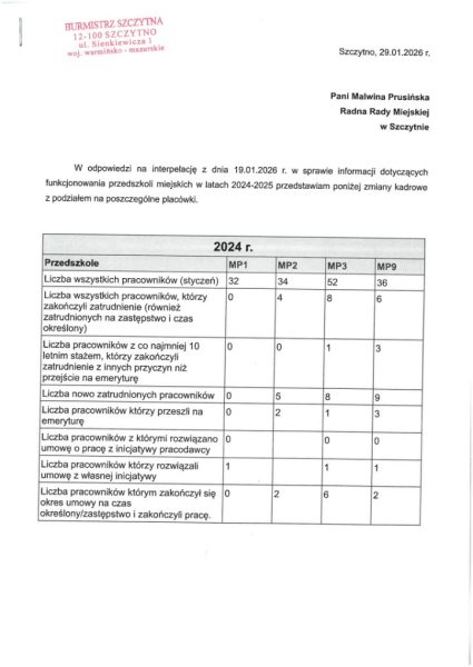 Ilu pracowników odeszło z miejskich przedszkoli w latach 2024–2025, ilu zatrudniono nowych i z jakich powodów kończyły się umowy? Radna Malwina Prusińska złożyła interpelację do burmistrza Stefana Ochmana. Wprost prosi o dane rozbite na placówki i o informację, ile skarg na dyrektorów trafiło do urzędu – także w kontekście przedszkola „Promyczek”, o którym w Szczytnie mówi się od miesięcy.