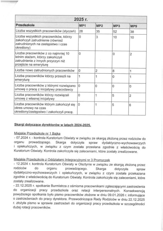 22 grudnia 2025 r. burmistrz spotkał się z ośmioma pracownikami przedszkola, którzy zgłosili zastrzeżenia do organizacji pracy i relacji interpersonalnych. 9 stycznia 2026 r. wpłynęło pismo pracowników z informacją o zastrzeżeniach wobec pracy dyrektora. Tego samego dnia przewodnicząca Rady Rodziców złożyła pismo dotyczące organizacji pracy, w tym dużej rotacji kadry.