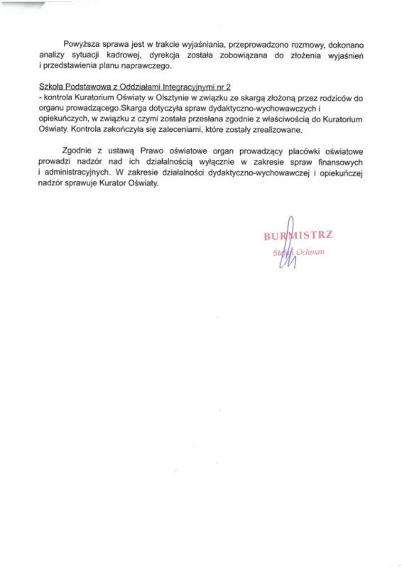 Na końcu odpowiedzi burmistrz przypomina, że organ prowadzący sprawuje nadzór nad placówkami w zakresie finansowym i administracyjnym, natomiast nadzór pedagogiczny sprawuje Kurator Oświaty.