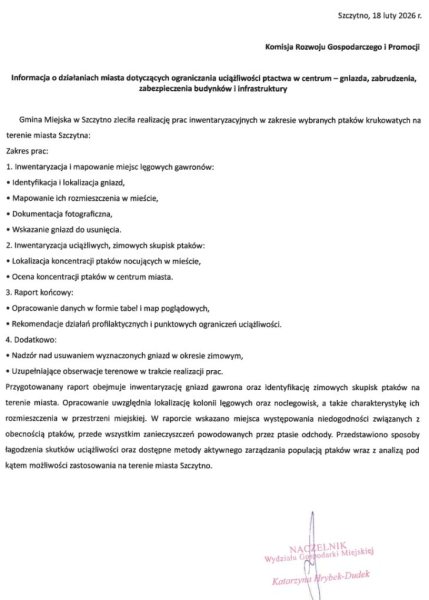 Miasto zleciło także inwentaryzację zimowych skupisk ptaków – lokalizację miejsc noclegowych oraz ocenę koncentracji w centrum. Przewidziano nadzór nad usuwaniem wyznaczonych gniazd w okresie zimowym oraz dodatkowe obserwacje terenowe.