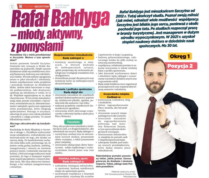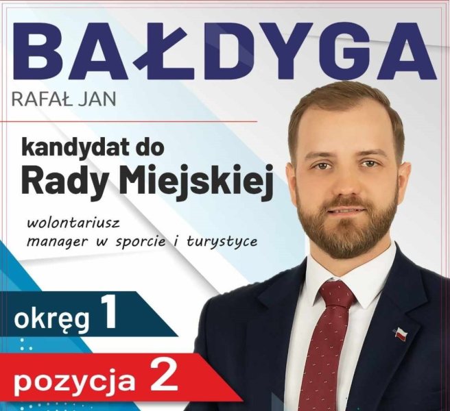 Materiał wyborczy. Rafał Bałdyga jest mieszkańcem Szczytna od 2012 r. Tutaj ukończył studia. Poznał swoją miłość i jak mówi, odnalazł wiele możliwości współpracy. Szczytno jest bliskie jego sercu, ponieważ z okolic pochodzi jego tata. Po studiach rozpoczął pracę w branży turystycznej. Jest managerem w dużym ośrodku wypoczynkowym. W 2021 r. uzyskał stopień naukowy doktora w dziedzinie nauk społecznych. Ma 30 lat.