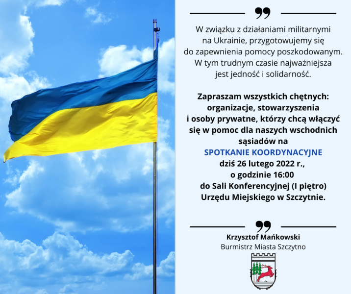 Zapraszamy wszystkich chętnych: organizacje, stowarzyszenia i osoby prywatne, którzy chcą włączyć się w pomoc dla naszych wschodnich sąsiadów na SPOTKANIE KOORDYNACYJNE dziś 26 lutego 2022 r., o godzinie 16:00 do Sali Konferencyjnej (I piętro) Urzędu Miejskiego w Szczytnie.