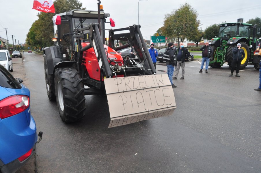 Przed godz. 9 zaczęły zjeżdżać potężne ciągniki. Zaparkowały na ulicy Rynek wzdłuż ruchliwej krajówki. Finalnie pojawiło się kilkudziesięciu rolników. Były flagi i transparenty. Chwilę po godz. 9 część rolników poszła chodnikiem i przez przejścia dla pieszych w pobliże ronda, a część zaczęła jeździć po nim ciągnikami. Droga była systematycznie blokowana, ale co chwila też udrażniana.