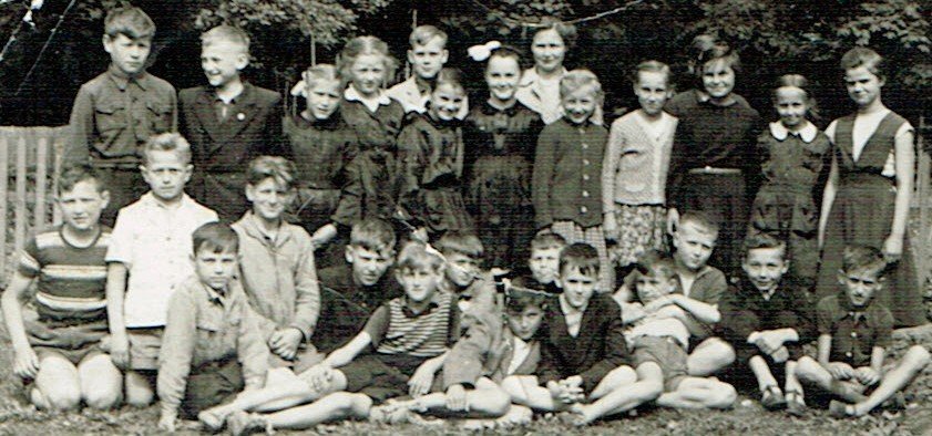 Siedzę wśród uczniów klasy V „b”, po lewej stronie, w koszulce w paski. Na samej górze wychowawczyni p. Henryka Skarżyńska. Kilku z kolegów spotykam, wielu zmarło, o reszcie słuch zaniknął.