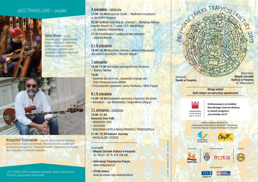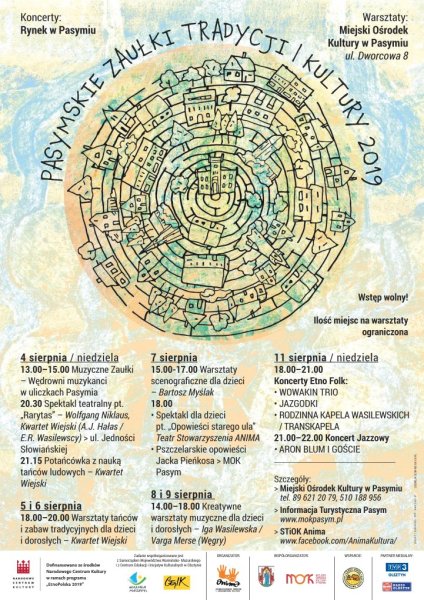 Za sprawą Stowarzyszenia Twórców i Orędowników Kultury ANIMA – organizatora oraz Miejskiego Ośrodka Kultury w Pasymiu – współorganizatora wydarzenia pn. Pasymskie zaułki tradycji i kultury 2019 – mieszkańcy Pasymia i jego okolic, a także wypoczywający tu wczasowicze, będą mogli uczestniczyć w kilkudniowym cyklu warsztatów, spektakli i koncertów. Miejscem tych zdarzeń będzie przestrzeń miejska Pasymia – jego uliczki i zaułki oraz rynek, a także Miejski Ośrodek Kultury.